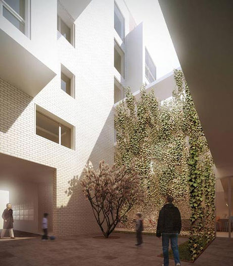 - Le contexte urbain impose une réflexion sur la densité du programme et sa répartition sur le terrain. Les deux fronts bâtis sont liés par un espace ouvert, végétalisé et partagé par tous les résidents qui s’inspire des cours intérieures du quartier.